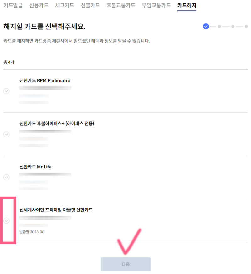 - 해지할 카드를 선택한 후 ‘카드해지’ 버튼을 클릭합니다.