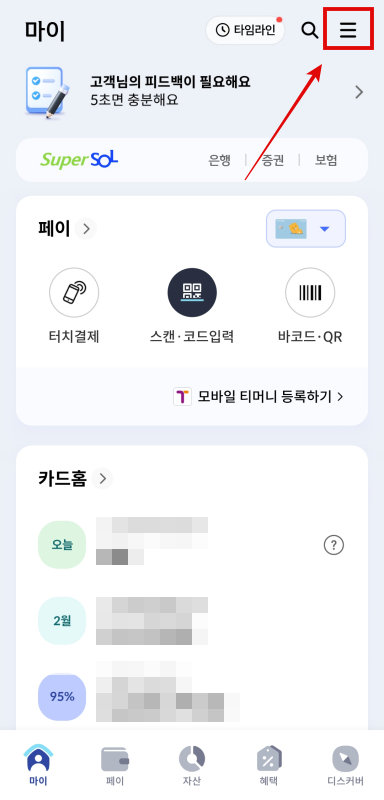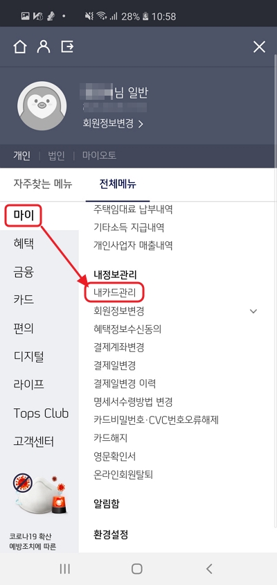 - 메뉴에서 [마이] > [내 카드관리]를 선택합니다.