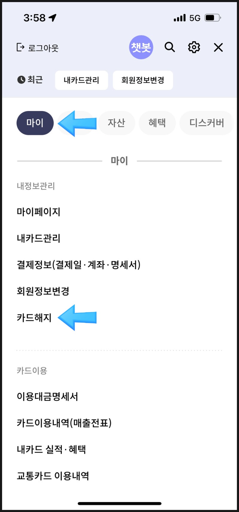 - [마이] 메뉴에서 [내 정보 관리]를 선택한 후, [카드 해지] 메뉴로 이동합니다.