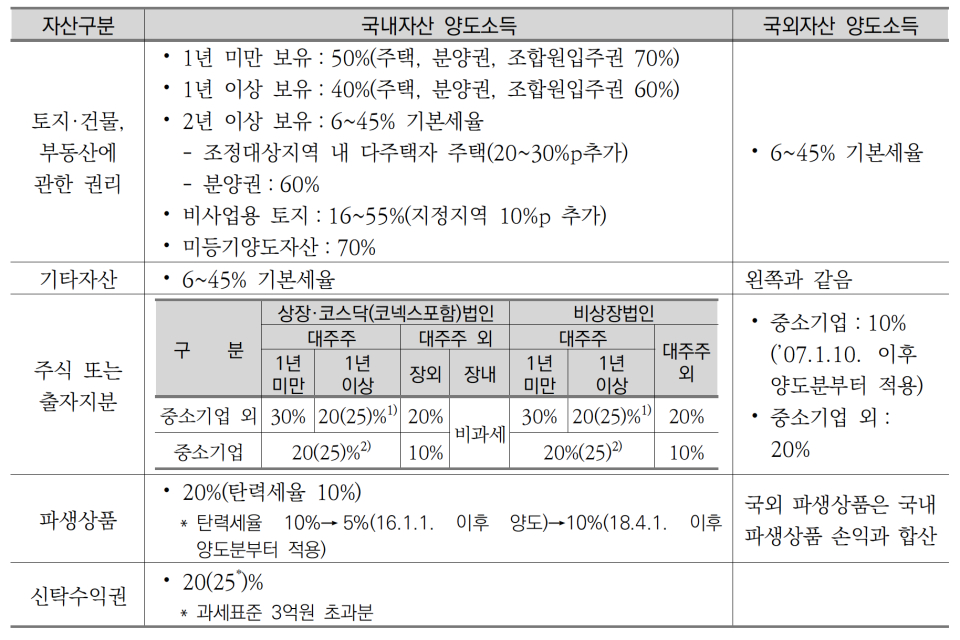 *단기 보유 자산은 1년 미만 70%, 2년 미만 60% 중과세율이 적용돼요.