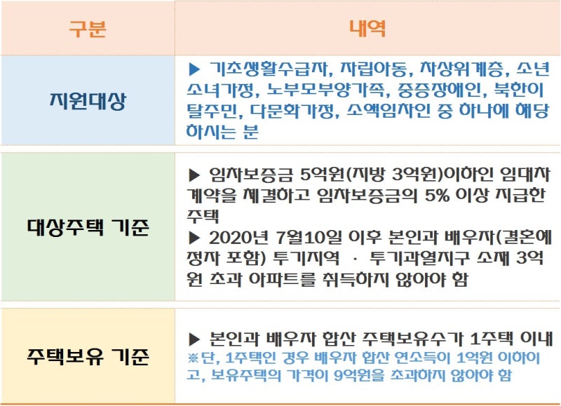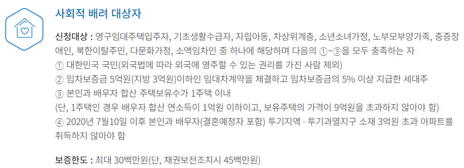 이 대출은 기초생활수급자뿐만 아니라 차상위계층, 다문화가정 등 사회적으로 배려가 필요한 분들을 대상으로 해요. 전세 보증금을 마련하기 힘든 분들에게 저렴한 이자나 아예 이자가 없는 대출을 해주거나, 이자의 일부를 대신 내주기도 하고, 보증까지 서주는 등 여러 가지 방법으로 지원해준답니다.