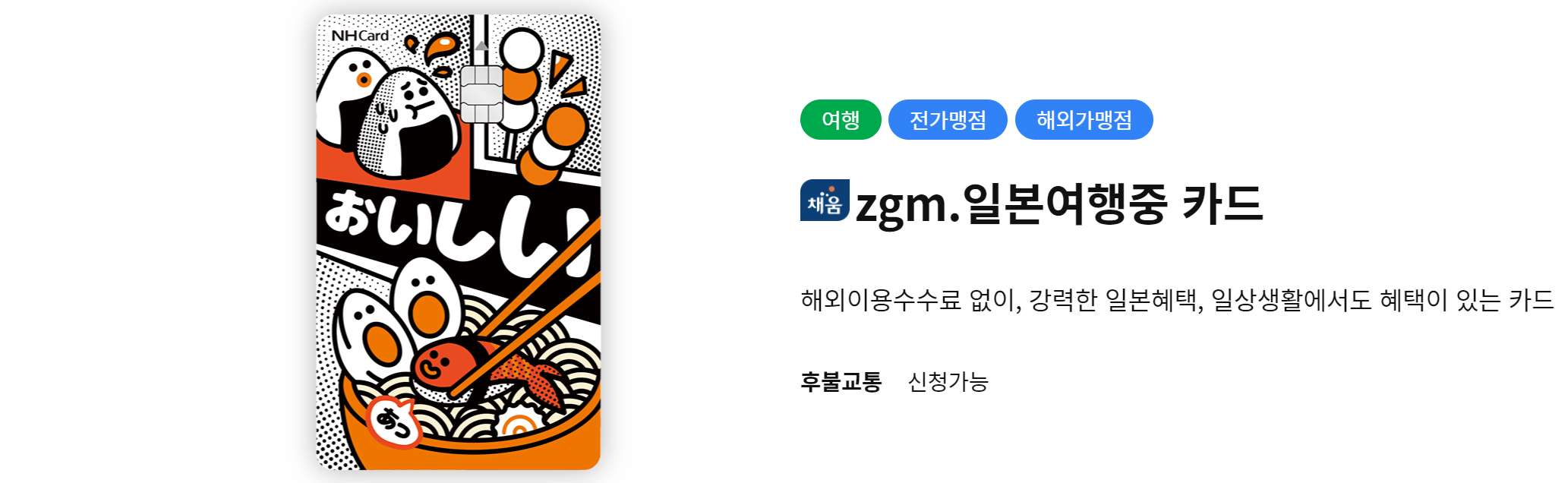 | NH농협카드 zgm.일본여행중 | 일본 오프라인 10% 적립, 라운지 무료, 해외 결제 무료 |