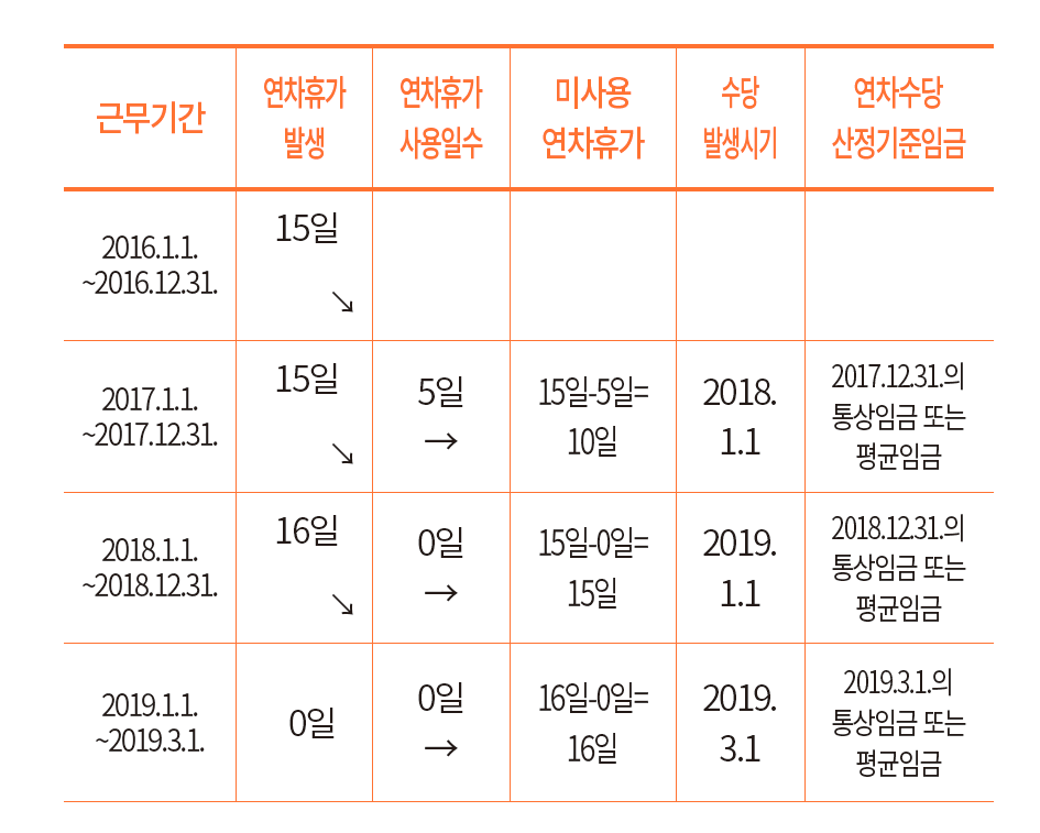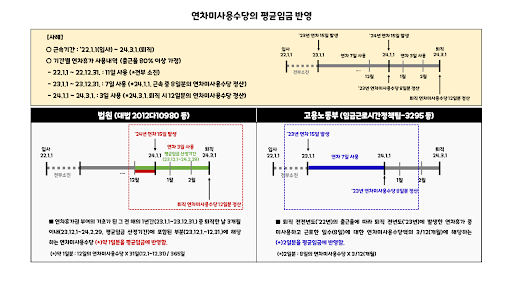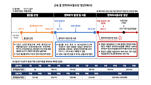 - 1년 미만 근로자의 연차: 1년 미만 근로자는 매월 1일씩 연차가 생기며, 미사용분은 입사 1년이 되는 시점의 임금을 기준으로 다음 달에 지급됩니다.