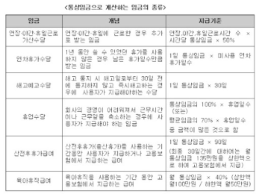 - 퇴사 시 계산: 퇴사일 기준 남은 연차일수 × 1일 통상임금(또는 평균임금)