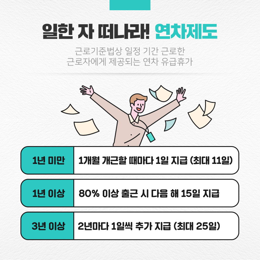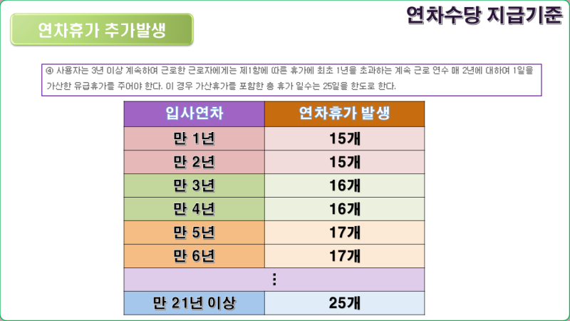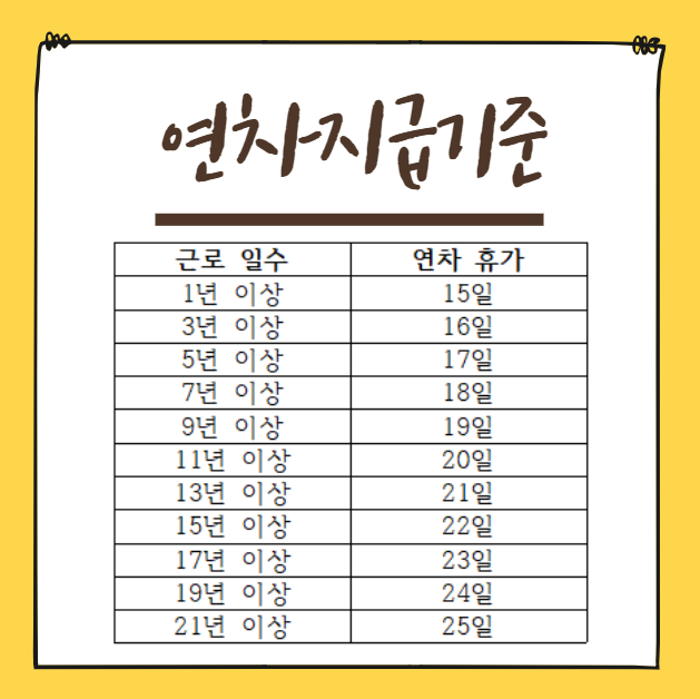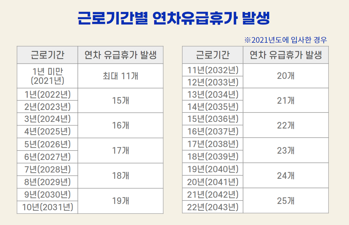 - 1년 이상 근로자: 매년 15일의 연차가 발생하며, 2년마다 1일씩 추가되어 최대 25일까지 늘어납니다.
