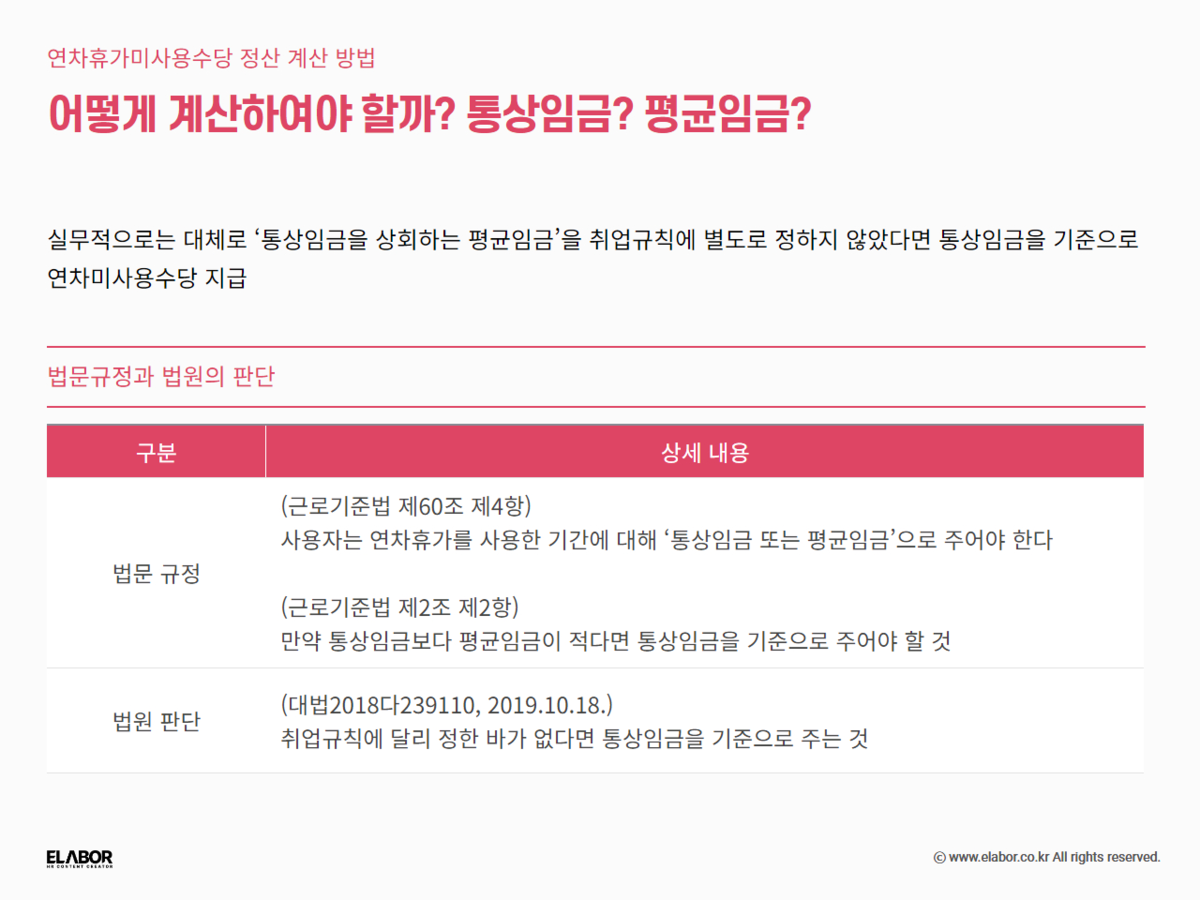 - 지급 기준 명확화: 연차 수당을 통상임금으로 계산할지, 평균임금으로 계산할지는 근로계약서나 취업규칙에 명확하게 정해두어야 나중에 회사와 근로자 간의 분쟁을 막을 수 있습니다.