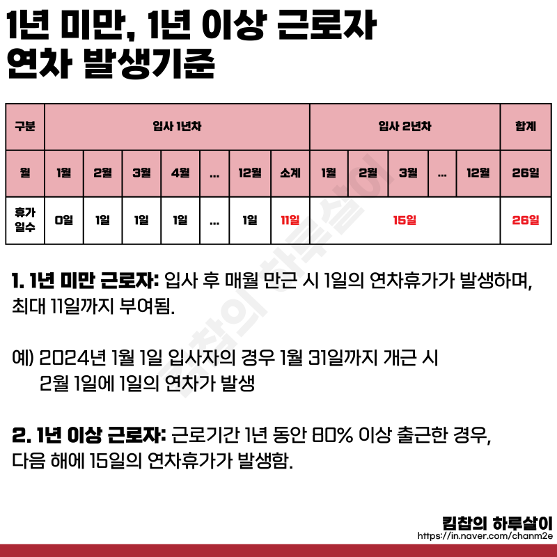 - 출근율 80% 미만: 출근율에 비례하여 연차가 발생하니, 이 점도 알아두시면 좋습니다.